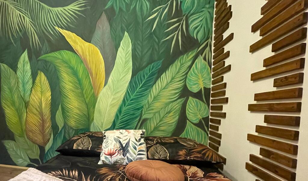 Oferujemy komfortowy pokój dwuosobowy, idealny dla małżeństw lub par. W sypialni znajdziesz niepowtarzalną atmosferę, dzięki artystycznie wymalowanej ścianie, która nadaje wnętrzu wyjątkowego charakteru. Łóżko małżeńskie, zapewniające wygodny i relaksujący wypoczynek po dniu pełnym atrakcji. Dodatkowym atutem pokoju są drzwi balkonowe z wyjściem na taras